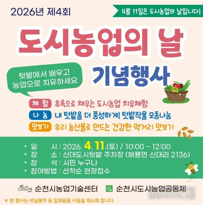 시민행정신문 강갑수 기자 | 순천시는 오는 4월 11일 오전 10시 신대도시텃밭에서 ‘2026년 제4회 도시농업의 날 기념행사’를 개최한다고 밝혔다.