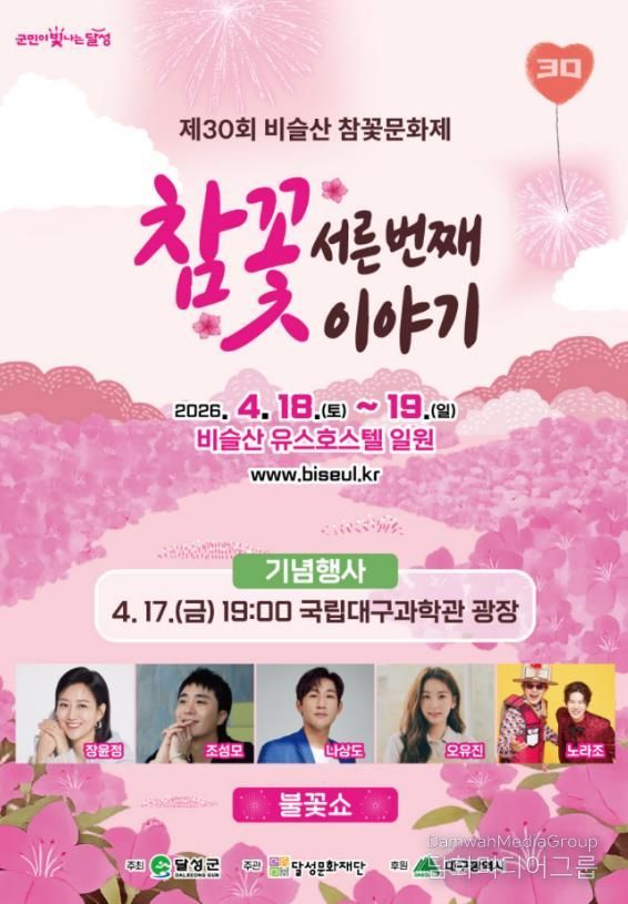 최재훈 달성군수는 “제30회를 맞이한 비슬산 참꽃문화제가 전국의 방문객이 함께 즐기는 달성군 대표 봄축제로 자리매김할 수 있도록 다채로운 프로그램을 준비했다”며, “많은 분들이 축제장을 찾아 봄의 정취와 수준 높은 문화공연을 함께 즐기시길 바란다”고 전했다.