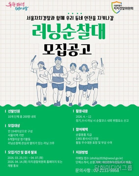 시민행정신문 이존영 기자 | 서울시 자치경찰위원회는 러닝을 하며 동네 안전까지 함께 살피는 시민 참여형 활동인 서울 러닝 순찰대에 참여할 2026년 신규 대원을 모집한다. 올해는 10개 단체(크루) 200명 규모로 확대해 운영할 계획이다.