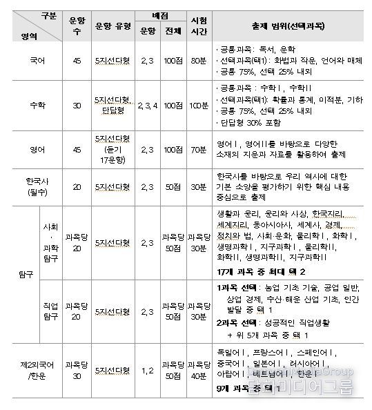 2. 국어, 수학 영역은 ‘공통과목+선택과목’ 구조에 따라 공통과목은 공통 응시하고, 영역별 선택과목 중 1개 과목을 선택함.