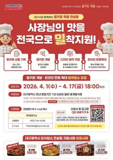 시민행정신문 이세훈 기자 | 대구광역시는 지역 외식업소의 경쟁력을 높이고 온라인 시장 진출을 돕기 위한 ‘2026년 외식업소 밀키트 개발 컨설팅 지원사업’ 참여업소를 오는 4월 17일까지 모집한다.