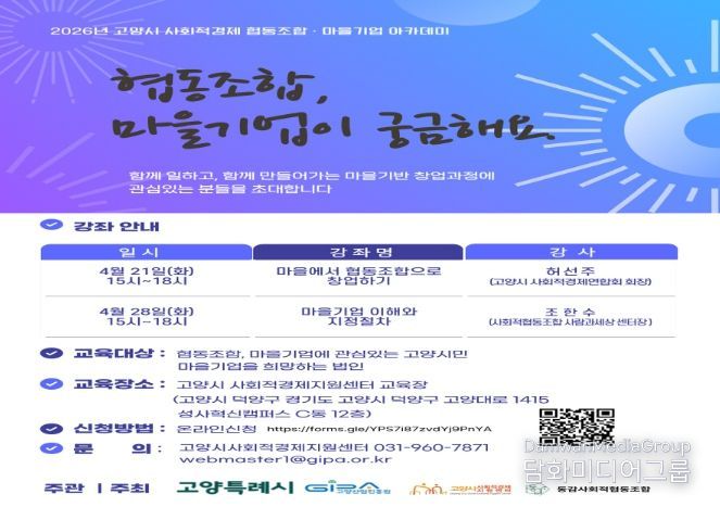 시민행정신문 이세훈 기자 | 고양산업진흥원 고양시사회적경제지원센터가 ‘2026년 고양시 사회적경제 협동조합·마을기업 아카데미’수강생을 오는 4월 17일까지‘모집한다.
