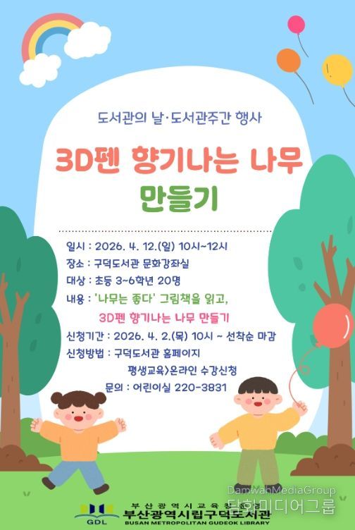 시민행정신문 기자 | 부산광역시립구덕도서관은 오는 12일 도서관 문화강좌실에서 초등학교 3~6학년 20명을 대상으로 ‘3D펜 향기나는 나무 만들기’를 운영한다.