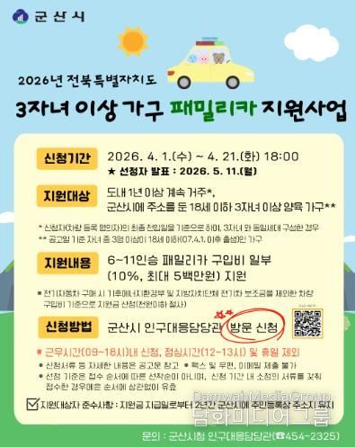 시민행정신문 강갑수 기자 | 군산시는 다자녀 가구의 경제적 부담을 완화하고 이동 편의를 제공하여 저출생 위기를 극복하고자 ‘2026년 전북특별자치도 3자녀 이상 가구 패밀리카 지원사업’ 참여자를 모집한다고 밝혔다.
