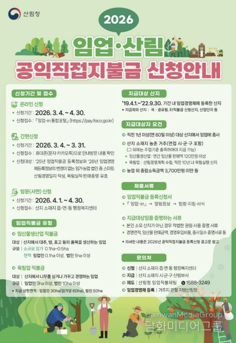 시민행정신문 강갑수 기자 | 괴산군은 2026년 임업‧산림 공익직접지불금 방문 신청접수를 오는 30일까지 실시한다고 1일 밝혔다.
