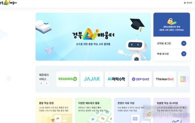 ‘경북AI배움터’는 학생 맞춤형 교육을 실현하고 교원의 수업 혁신을 지원하기 위해 구축된 인공지능 교수․학습 플랫폼으로, 한 번의 로그인으로 국내외 다양한 에듀테크 서비스를 활용하고 학습 데이터를 분석해 개별 맞춤형 교육을 지원하는 것이 특징이다.