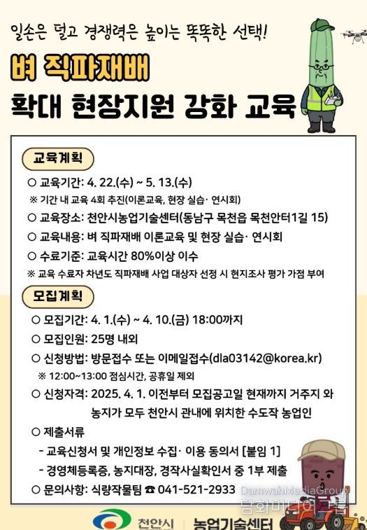 시민행정신문 강갑수 기자 | 천안시농업기술센터는 오는 10일까지 ‘벼 직파재배 확대 현장지원 강화 교육’ 참여자를 모집한다고 1일 밝혔다.