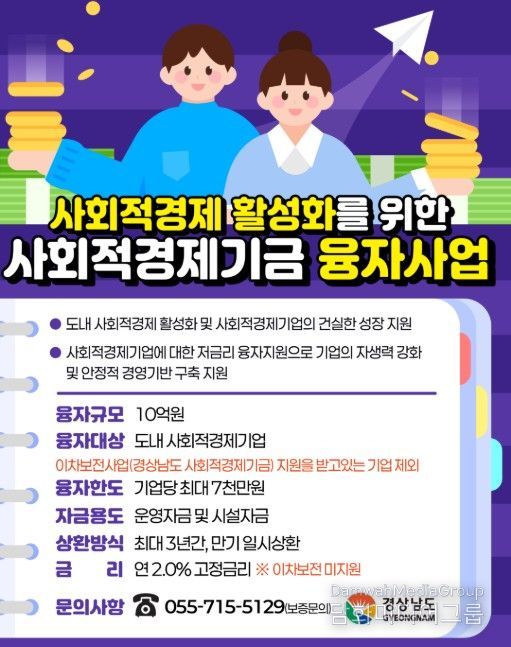 김인수 경남도 경제통상국장은 “사회적경제기업은 지역경제의 선순환 구조를 만드는 핵심축”이라며, “이번 지원이 자금난을 겪는 기업에 실질적인 ‘버팀목’이 되길 기대한다”고 말했다.