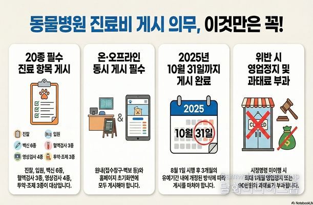 이번 점검은 2025년 8월 시행된 동물병원 진료비 게시제도의 적정 이행 여부와 전반적인 운영 실태를 확인하기 위해 추진된다.