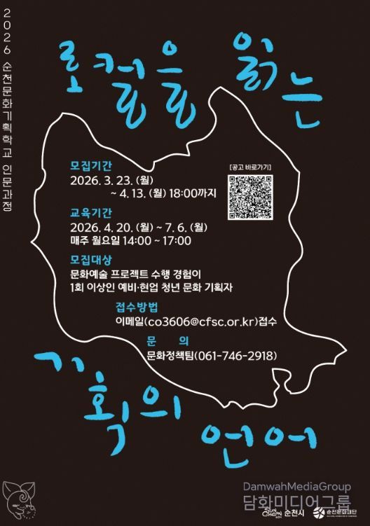 시민행정신문 강갑수 기자 | (재)순천문화재단은 오는 13일까지 ‘2026 순천문화기획학교 인문과정 '로컬을 읽는 기획의 언어'(이하 인문과정)’ 수강생을 공개 모집한다.
