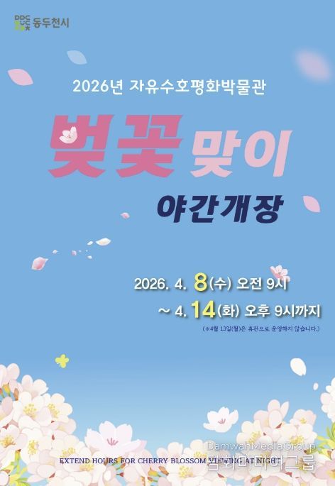 시민행정신문 강갑수 기자 | 동두천시 자유수호평화박물관은 오는 4월 8일부터 14일까지 6일간(4월 13일 월요일 정기 휴관) 벚꽃 개화기를 맞아 자유수호평화박물관 개관 시간을 기존 오후 6시에서 오후 9시까지 연장 운영한다고 밝혔다.