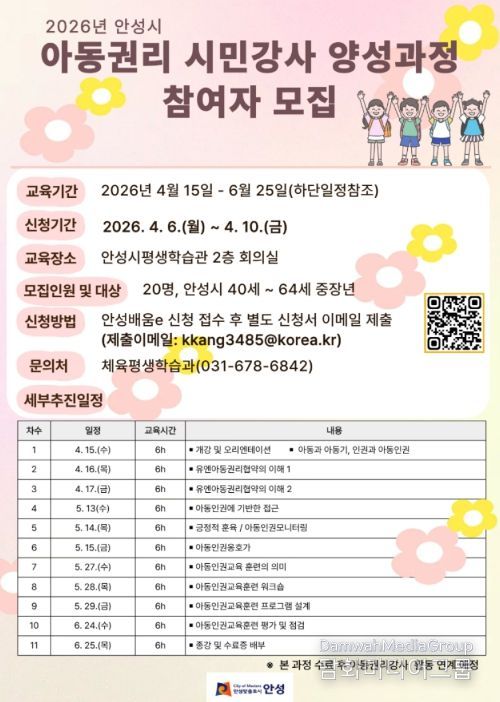 안성시 관계자는 “이번 과정이 중장년층의 새로운 사회참여 기회를 제공하는 동시에, 지역사회에 아동권리 문화가 확산되는 계기가 되기를 기대한다”고 말했다.