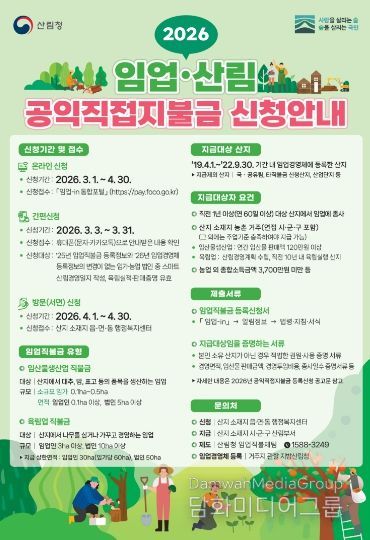 시민행정신문 강갑수 기자 | 울진군은 임업인의 소득 안정과 산림의 공익기능 증진을 위한 ‘2026년 임업·산림 공익직접지불금(이하 임업직불금)’방문 신청을 4월 1일부터 4월 30일까지 한 달간 접수한다.