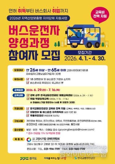 한편, 버스운전자 양성과정은 2026년 지역산업 맞춤형 자치단체 지원사업에 선정된 사업으로 (사)고양시기업‧경제인연합회가 수행하고 있다. 특히 2018년부터 공모사업에 9년 연속 선정돼 고양시 버스 운수업체의 운전기사 부족 문제를 해소하는 데 기여하고 있다.