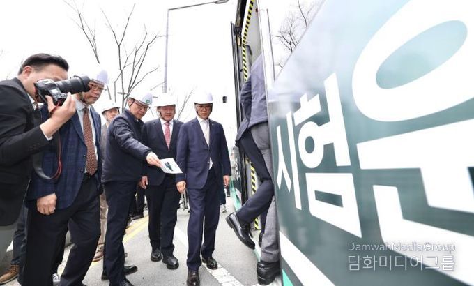시민행정신문 기자 | 조원휘 대전시의회 의장과 송인석 산업건설위원장이 1일 대전 유성구 도안동 호수공원 일원에서 국내 최초로 실시된 3칸 굴절차량 도로 시험 운행 현장을 점검했다.