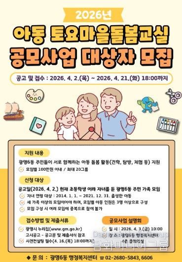 시민행정신문 강갑수 기자 | 광명시 광명6동 행정복지센터는 오는 21일까지 ‘2026년 아동 토요마을돌봄교실 공모사업’에 참여할 주민 가족 모임 20개 팀을 모집한다.