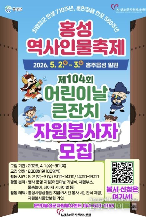 시민행정신문 강갑수 기자 | (사)홍성군자원봉사센터는 오는 5월 2일부터 3일까지, 이틀간 홍주읍성 일원에서 개최되는 ‘2026 홍성군역사인물축제 × 어린이날 큰 잔치’의 성공적인 운영을 위해 자원봉사자 200명을 모집한다고 밝혔다.