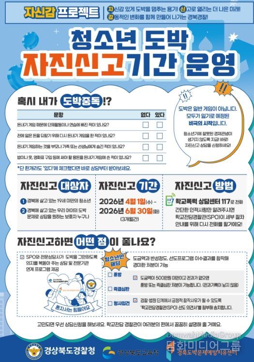 시민행정신문 기자 | 경북교육청은 6월 30일까지 3개월간 경북경찰청, 경북도박문제예방치유센터와 함께 ‘청소년 도박 자진신고 기간’을 운영한다고 2일 밝혔다.