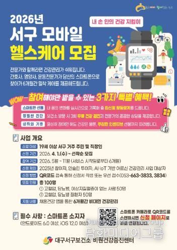 시민행정신문 기자 | 대구 서구보건소는 정보통신기술(ICT)을 활용해 주민들의 생활 습관을 개선하고 만성질환을 예방하는 ‘2026년 모바일 헬스케어’ 사업 참여자를 4월 1일부터 선착순으로 모집한다고 밝혔다.