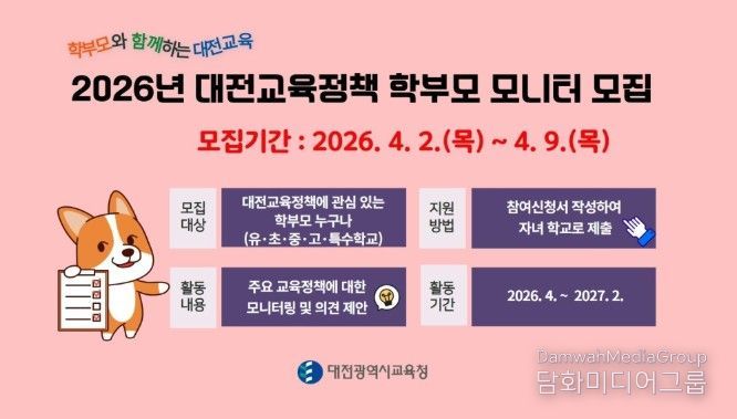 시민행정신문 기자 | 대전시교육청은 2026년 대전 교육 정책 학부모 모니터를 4월 2일부터 9일까지 각급 학교 학부모를 대상으로 모집한다고 밝혔다.