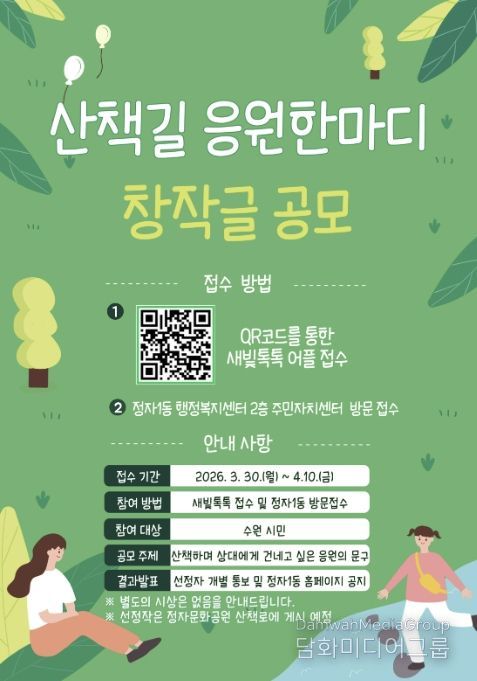 시민행정신문 강갑수 기자 | 수원시 장안구 정자1동은 2026년 주민참여예산 사업인 '아름다운 글귀가 있는 거리 조성' 추진에 따라 정자문화공원 산책로에 설치할 ‘산책길 응원 한마디’ 표지판 창작글을 공모한다고 밝혔다.