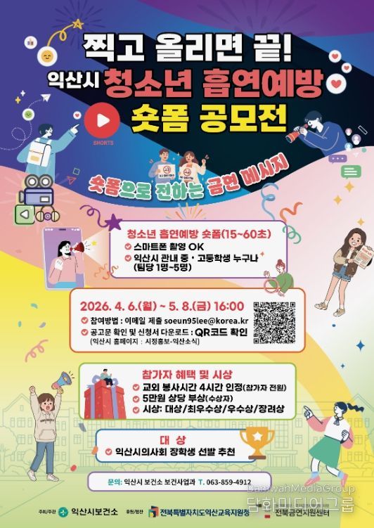 시민행정신문 강갑수 기자 | 익산시보건소는 지역 중·고등학생을 대상으로 '청소년 흡연예방 숏폼 공모전'을 오는 4월 6일부터 5월 8일까지 진행한다.