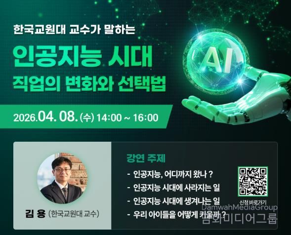 강연은 한국교원대학교 김용 교수가 맡아 인공지능 기술의 현재 수준과 함께 변화하는 직업 세계를 분석하고, 사라지거나 새롭게 등장하는 직업군의 흐름을 설명할 예정이다.