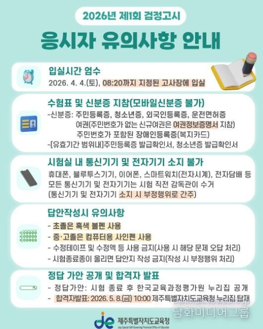 시민행정신문 기자 | 제주특별자치도교육청은 4일 ‘2026년도 제1회 초졸·중졸·고졸 검정고시’를 제주중앙중학교, 서귀중앙여자중학교, 제주교도소, 제주소년원 등 4곳에서 실시한다.