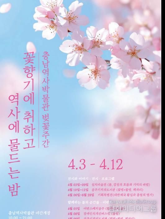 장기승 충청남도역사문화연구원장은 “이번 벚꽃 주간은 역사와 예술, 그리고 지역사회가 함께 어우러지는 풍성한 문화의 장이 될 것”이라며, “가족, 연인, 친구와 함께 박물관을 방문해 꽃향기에 취하고 역사에 물드는 아름다운 봄밤의 추억을 만들어 가시길 바란다”고 전했다.