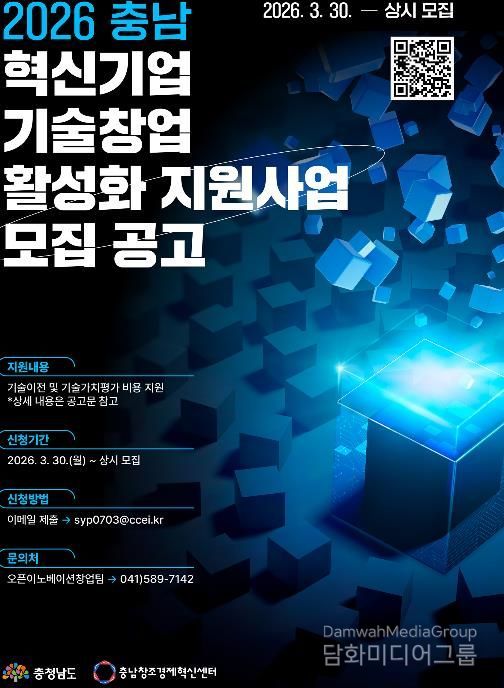 시민행정신문 강갑수 기자 | 충남창조경제혁신센터가 지역 창업기업의 기술 경쟁력을 높이고 성공적인 사업화를 돕기 위해 ‘2026년 충남 혁신기업 기술창업 활성화 지원사업’을 시행하고 참여 기업을 모집한다고 밝혔다.