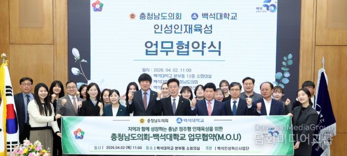충남도의회는 2일 백석대 본부동에서 홍성현 의장과 백석대 송기신 총장 등 양 기관 관계자들이 참석한 가운데 ‘인성인재양성 협력을 위한 업무협약’을 체결했다.