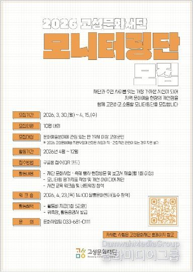 시민행정신문 강갑수 기자 | 평화 경제 거점 도시 강원 고성군 산하 고성문화재단은 재단이 추진하는 문화예술사업에 대한 군민 의견을 반영하고 사업 환류 체계를 강화하기 위해 ‘2026 고성문화재단 모니터링단’을 모집한다. 이번 사업은 군민 참여 기반의 현장 소통을 확대하고, 문화예술사업 운영의 투명성과 책임성을 높이기 위해 마련됐다.