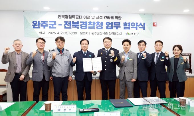 시민행정신문 강갑수 기자 | 완주군과 전북경찰청은 2일 완주군청 전략회의실에서 경찰특공대 이전 및 청사 신축을 위한 업무협약(MOU)을 체결하고 전북 경찰특공대 이전 사업을 본격적으로 추진하기로 했다.