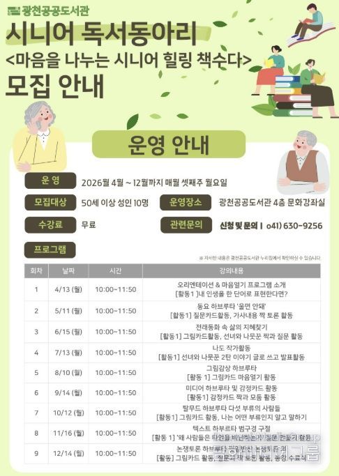 책과 독서에 관심 있는 관내 50세 이상 시니어라면 누구나 신청할 수 있으며 광천공공도서관누리집 프로그램 신청 또는 전화 접수로 신청하면 된다.
