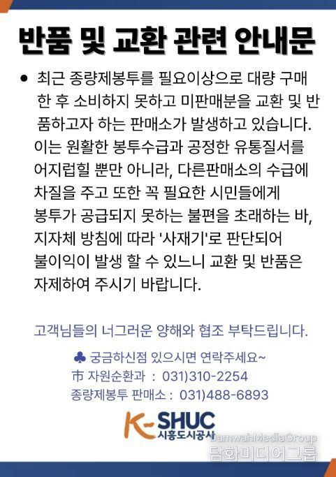 시흥도시공사 관계자는 “반품·환불 문의 증가는 공급 불안 우려가 해소 과정에서 나타나는 일시적 현상”이라며 “유통 질서 회복을 위해 재고 조정 및 관리 절차를 단계적으로 추진하고 있다”라고 설명했다.