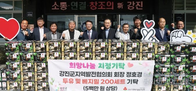 시민행정신문 강갑수 기자 | 강진군지역발전협의회 정호경 회장이 지난 2일 강진군청을 방문해 관내 취약계층을 위한 두유 및 베지밀 200세트(500만 원 상당)를 지정기탁하며 지역사회에 훈훈한 감동을 전하고 있다.