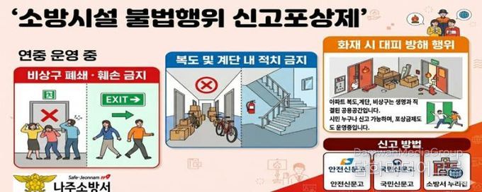 나주소방서 관계자는 “신고포상제를 통해 비상구 폐쇄·소방시설 차단 행위를 근절하고 가족, 이웃의 소중한 생명을 지킬 수 있도록 적극 동참해 주길 바란다”고 말했다.