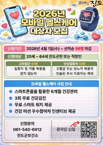 시민행정신문 강갑수 기자 | 진도군보건소는 4월 1일부터 ‘2026년 모바일 헬스케어 2기’ 대상자 56명을 선착순으로 모집하고 있다.