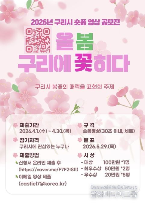 공모 주제는 구리시 봄꽃의 매력을 자유롭게 표현하는 콘텐츠로, 60초 이내의 세로형 영상이면 누구나 참여할 수 있다. 접수 기간은 4월 1일부터 4월 30일 24시까지다.