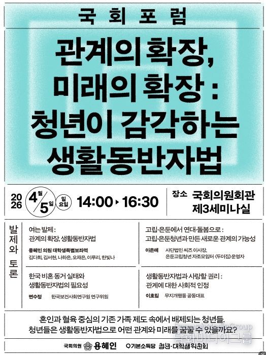 시민행정신문 이준석 기자 | 6 3 지방선거를 앞두고 다양한 청년정책이 발표되는 가운데, 청년 당사자가 직접 청년정책으로서 생활동반자법의 의미와 필요성을 조망하는 국회포럼이 개최된다. 이날 포럼에는 50여 명의 청년 당사자가 참석해 생활동반자법에 대한 의견을 나눌 예정이다.