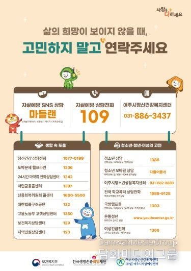 한편, 여주시민은 우울이나 불안 등으로 전문가의 도움이 필요한 경우 자살예방상담전화(109), 정신건강상담전화, 자살예방SNS상담 ‘마들랜’, 여주시정신건강복지센터(부설)자살예방센터를 통해 상담을 받을 수 있다.