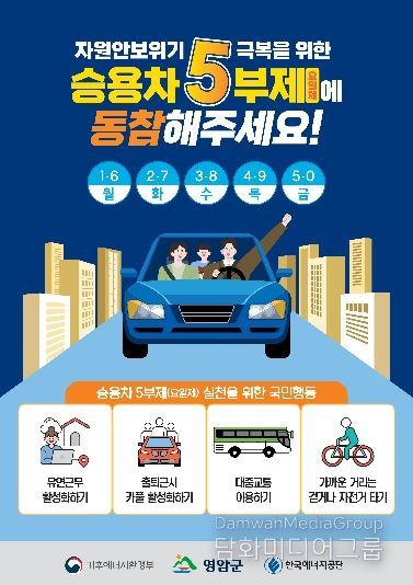 군은 지난 3월 26일부터 군청 출입 직원을 대상으로 승용차 요일제(5부제)를 시행하고 있으며, 3월 31일부터는 유관기관과 사회단체까지 참여를 확대해 절약 실천을 추진하고 있다.
