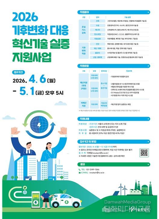 시민행정신문 김학영 기자 | 서울시는 4월 6일부터 5월 1일까지 ‘기후변화대응 혁신기술 실증 지원사업’에 참여할 서울 소재 기업․대학․연구기관을 모집한다. 기후 위기 대응 및 지속가능한 도시 조성의 일환으로 기후변화대응 혁신기술을 보유한 기업의 실증을 돕기 위함이다.