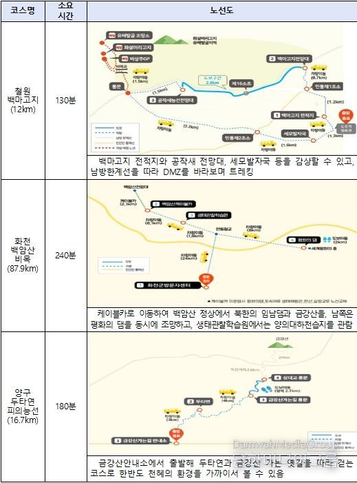 각 코스는 ▲6.25전쟁 당시 국군과 중공군 간 공방전 끝에 국군이 탈환한 ‘철원 백마고지 코스’, ▲가곡 ‘비목’의 배경으로 알려져 있으며, 케이블카로 오를 수 있는 ‘화천 백암산 비목 코스’, ▲전쟁 속에서도 자연의 모습을 간직한 ‘양구 두타연 피의능선 코스’, ▲백두대간의 아름다운 풍경을 바라보는 ‘인제 대곡리초소~1052고지 코스’, ▲동해안을 따라 이어지는 해금강과 금강산을 함께 조망하는 ‘고성 통일전망대․금강산전망대 코스’로 구성된다.