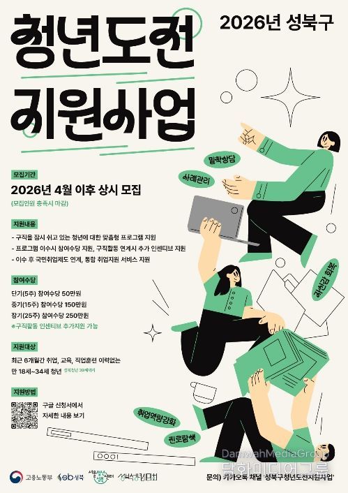 시민행정신문 강갑수 기자 | 성북구가 고용노동부 주관 공모사업에 선정돼 구직단념 청년 등의 사회 복귀를 지원하는 ‘2026 청년도전지원사업’ 참여자를 모집한다.