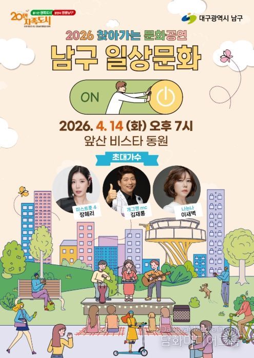 시민행정신문 기자 | 대구 남구는 지역 주민들에게 일상 속 문화 향유 기회를 확대하고, 지역 예술가들의 공연 활동을 지원하기 위해 ‘2026 찾아가는 문화공연’ 을 개최한다.