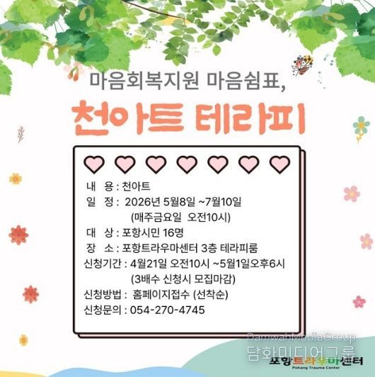 한편, 이번 프로그램의 신청 기간은 4월 21일부터 5월 1일까지이며, 포항트라우마센터 홈페이지를 통해 선착순으로 접수를 받는다.