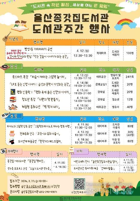 시민행정신문 강갑수 기자 | 울산 중구가 제62회 도서관의 날·도서관 주간(4. 12.~4. 18.)을 맞아 4월 11일부터 4월 18일까지 지역 내 도서관 10곳에서 ‘2026년 도서관의 날·도서관 주간 행사’를 개최한다.