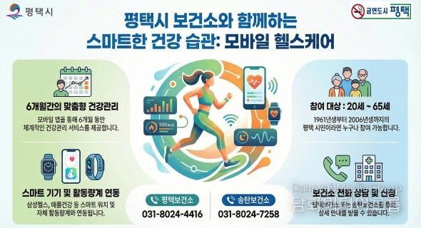 시민행정신문 기자 | 평택시가 시민들의 만성질환 예방과 건강한 생활 습관 형성을 돕기 위해 ‘2026년 보건소 모바일 헬스케어’ 사업을 시작하고 참여자를 선착순 모집하고 있다.