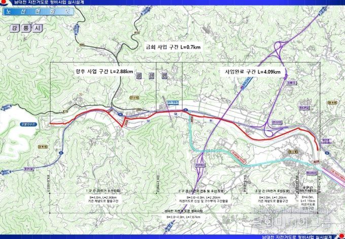강릉시는 지난해까지 회산교~여전교(4.09㎞) 구간을 우선 개설한 데 이어 오는 4월 성산면 구산강변길(0.7㎞) 구간 착공을 시작으로 연내 총 3.58㎞를 완료하여 전체 노선(7.67㎞)을 차질없이 개통할 예정이다.